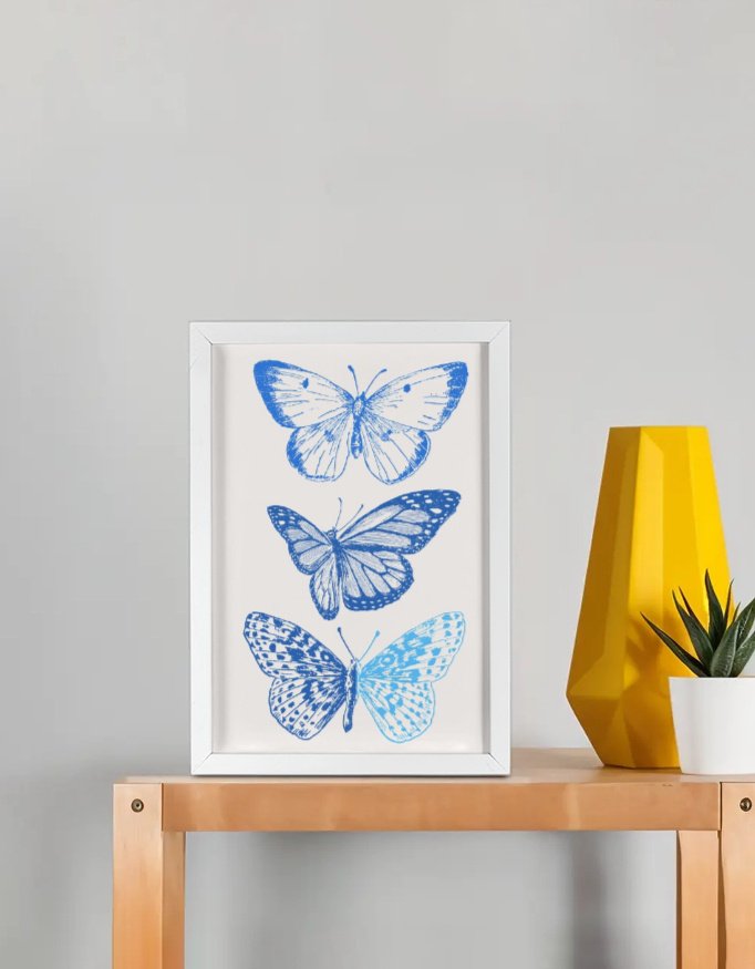 Elevate your space with our stunning “Indigo Butterfly Trilogy” framed print. This unique piece features three beautifully detailed butterfly sketches in varying shades of deep blue and indigo. Set against a clean, off-white background, the intricate line work and delicate shading of each butterfly create a sense of elegant simplicity. Perfect for adding a touch of nature-inspired artistry to any room, this print is ideal for minimalist, Scandinavian, or contemporary decor styles. It’s a timeless and captivating addition to your wall, bringing a sense of calm and beauty to your home or office.